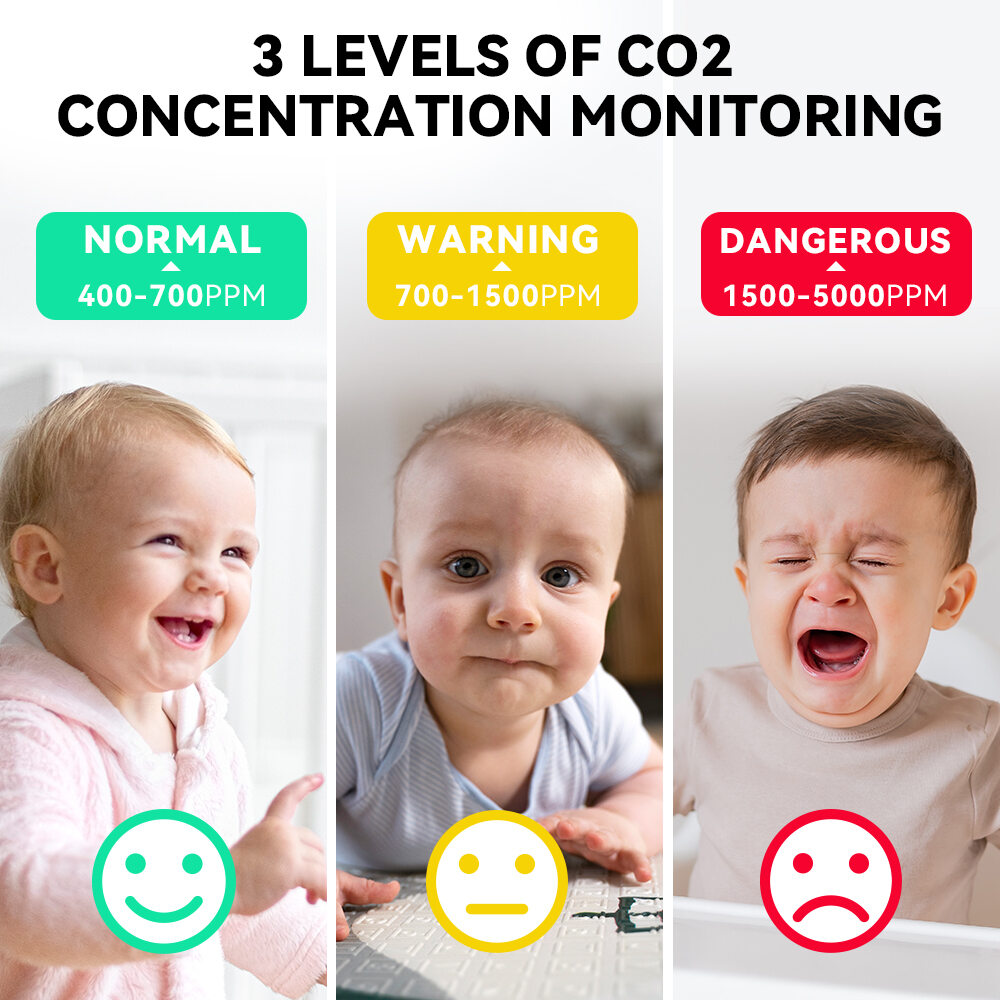 - Measure air temperature, humidity and carbon dioxide CO2 levels